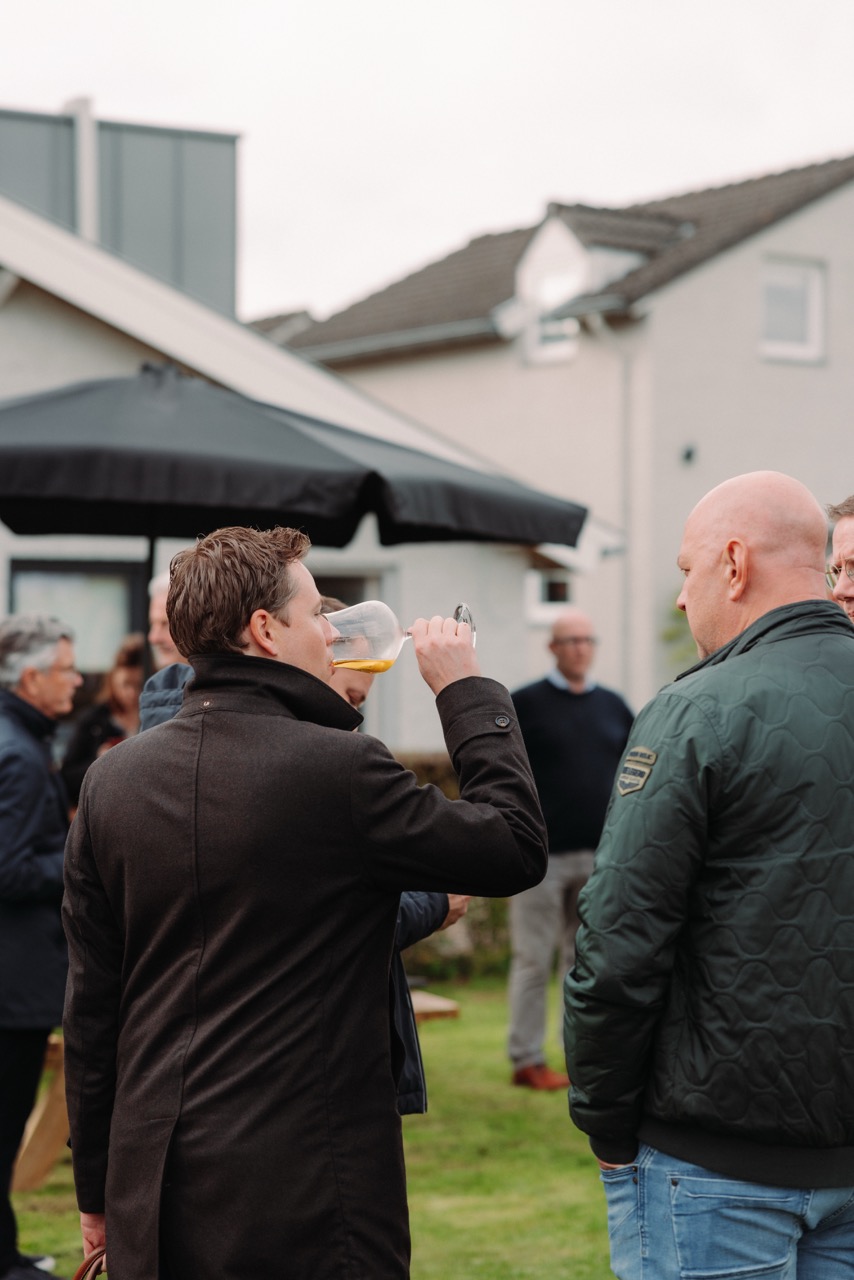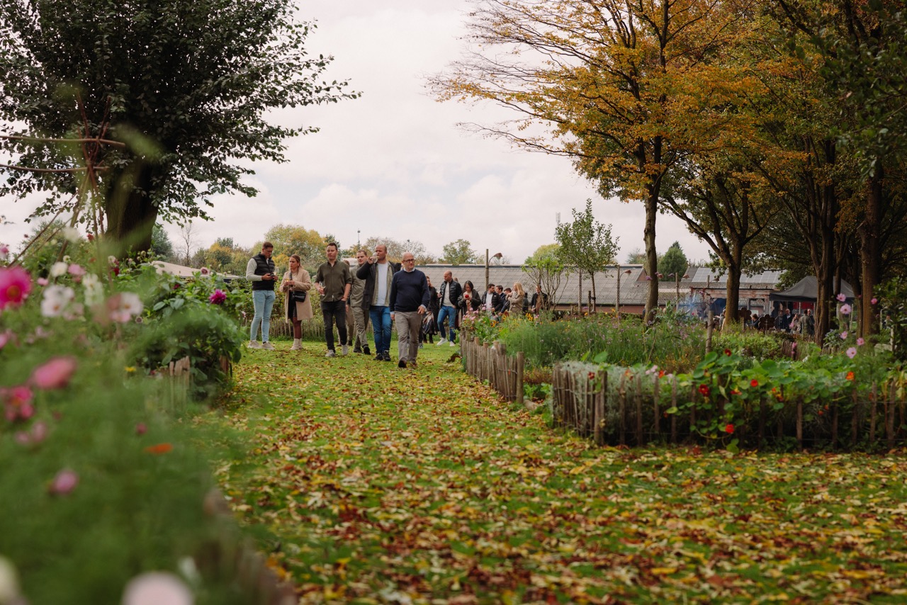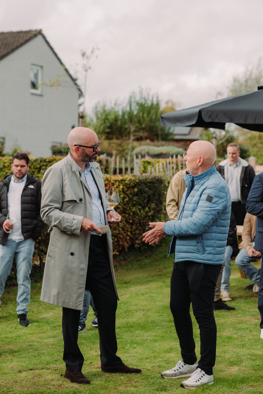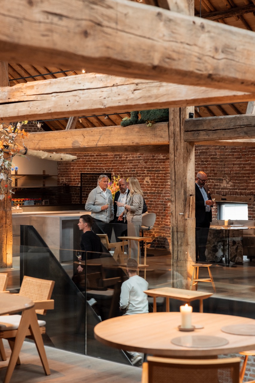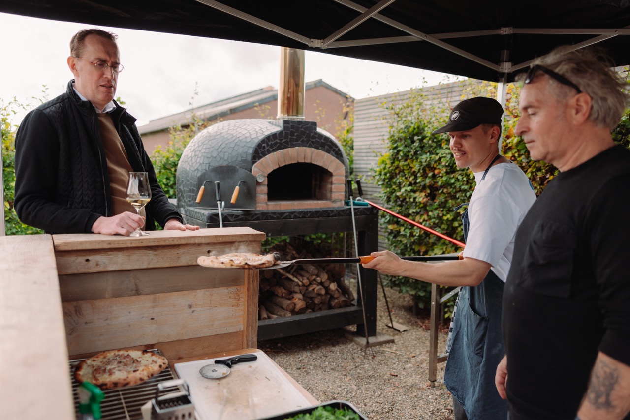 Daarna volgde een geweldige ontvangst bij Hans van Wolde. Eerst vertelde Hans zelf over wat hem drijft en waar hij mee bezig is. Vervolgens kreeg iedereen de kans een kijkje te nemen in het prachtige pand en te ervaren hoe gasten daar een totaalbeleving ondergaan. Buiten werden we verwend door lokale producenten, konden we de ontwikkeling van het totaalconcept met de tuin en de overnachtingsmogelijkheden bekijken, en sloten we gezellig af in de tent met mooie wijnen en bieren, verfijnde amuses, een lekkere punt pizza en heerlijke patisserie.